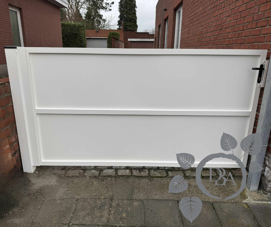 Cadre et soubassement en tubes d’acier Gonds réglables M16 à M30 suivant la longueur et serrure en acier inoxydable Poteaux à bétonner dans le sol inclus Finition galvanisée et plastifiée